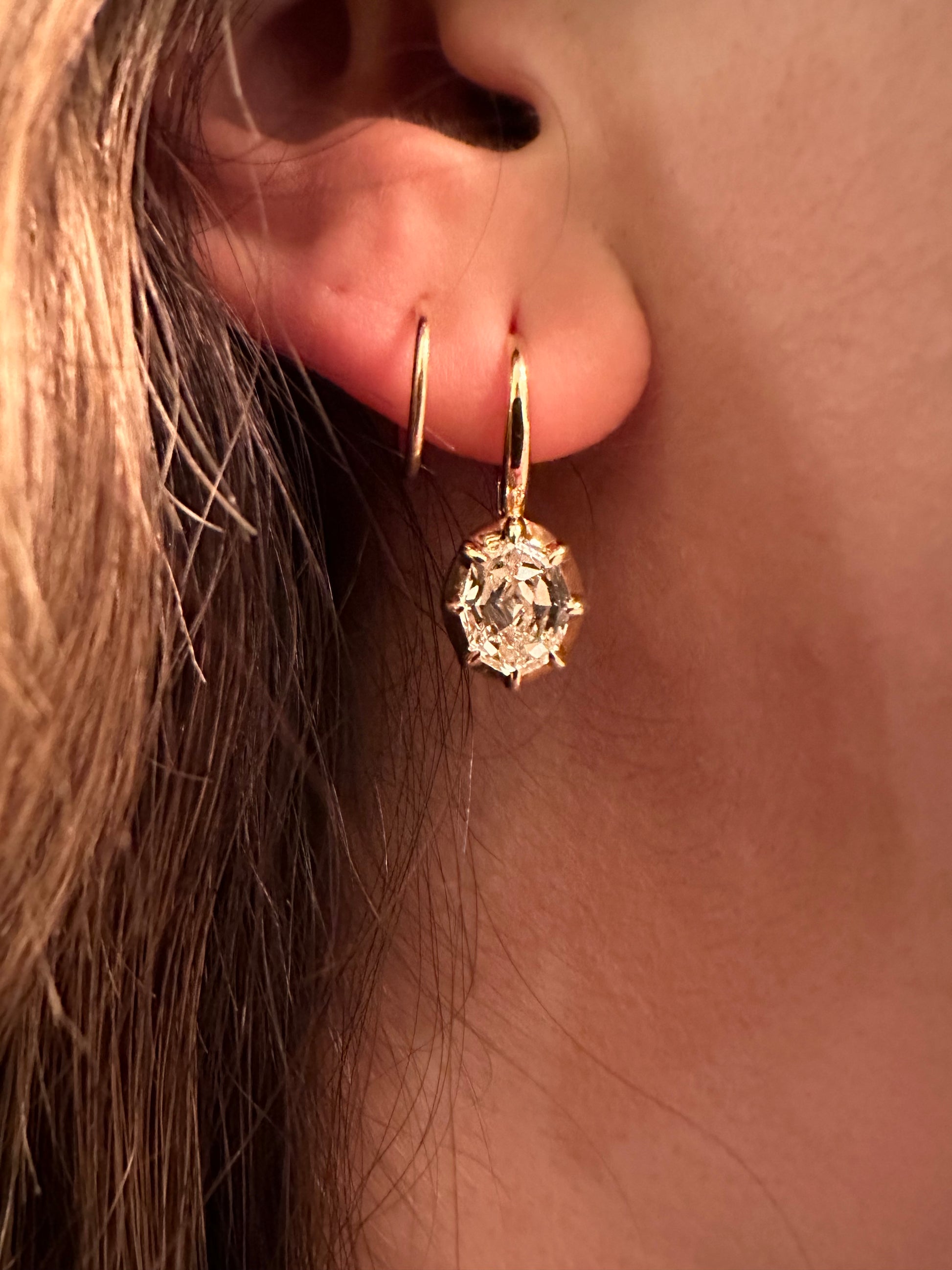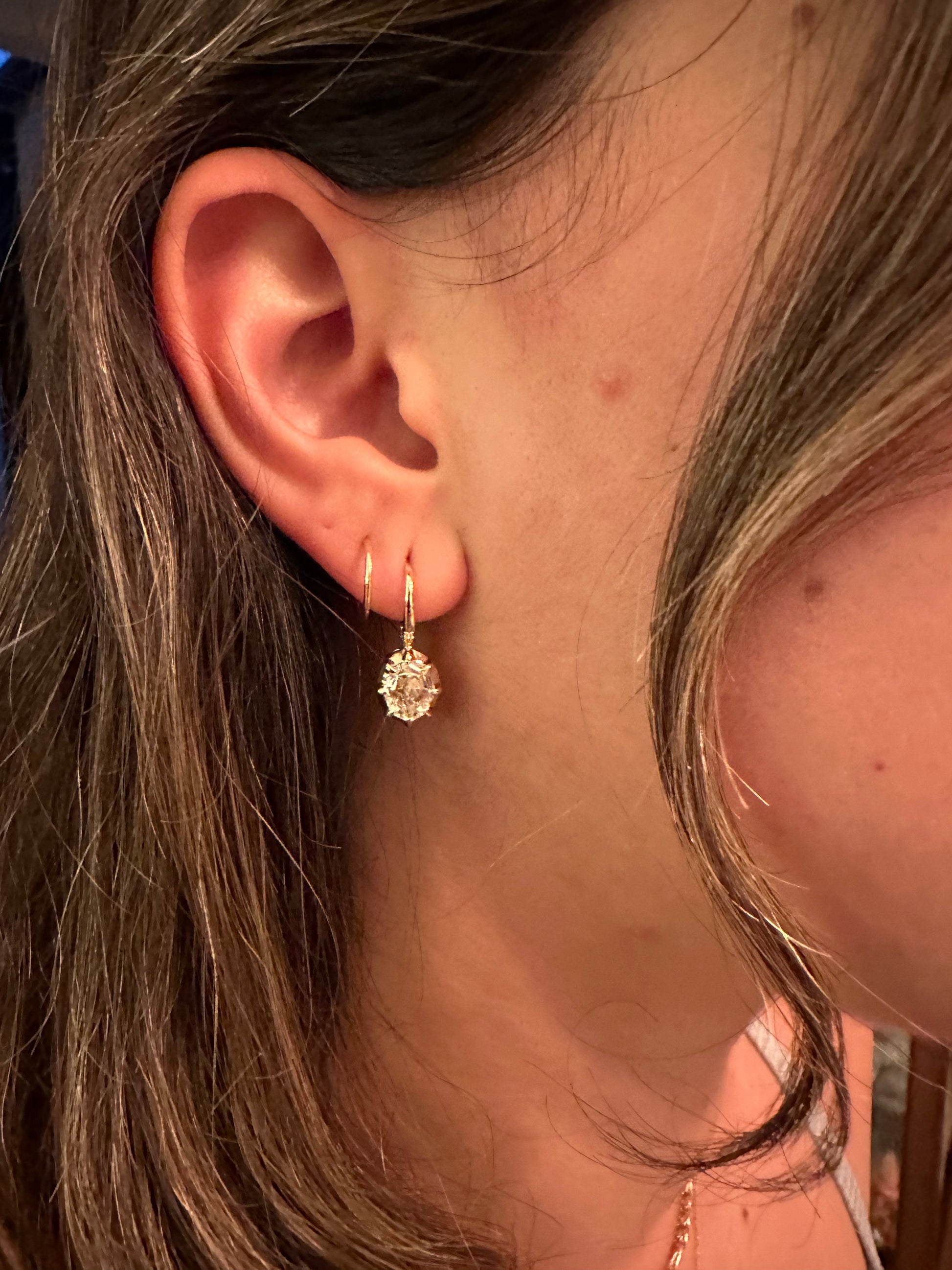 -3 carats total (1.50 carats each side) of natural champagne step cut oval diamond dangle earrings set in a yellow gold Victorian style drop