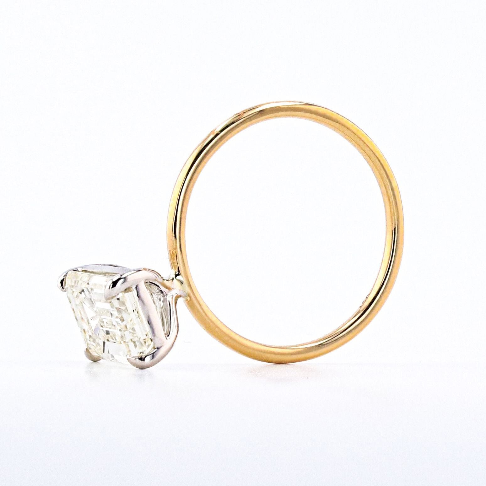 The custom two-tone setting is the perfect choice for highlighting the beauty of the diamond. The white gold basket brings out the whiteness of the diamond, allowing it to shine and sparkle from every angle. The dainty yellow gold band add a touch of warmth and contrast to the piece, giving it a unique and distinctive look.
