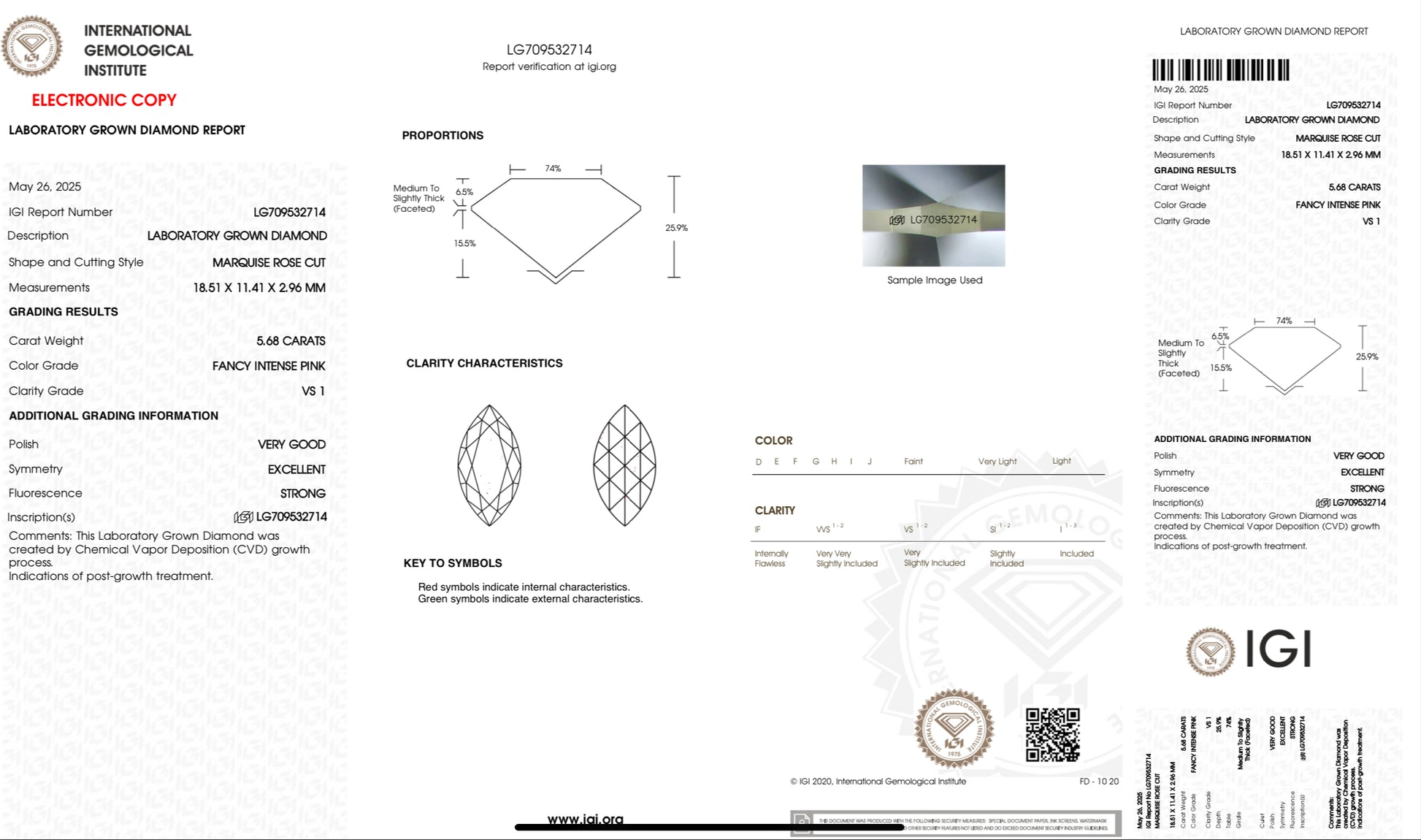 - Certification: IGI Laboratory Grown Diamond Report (LG709532714)