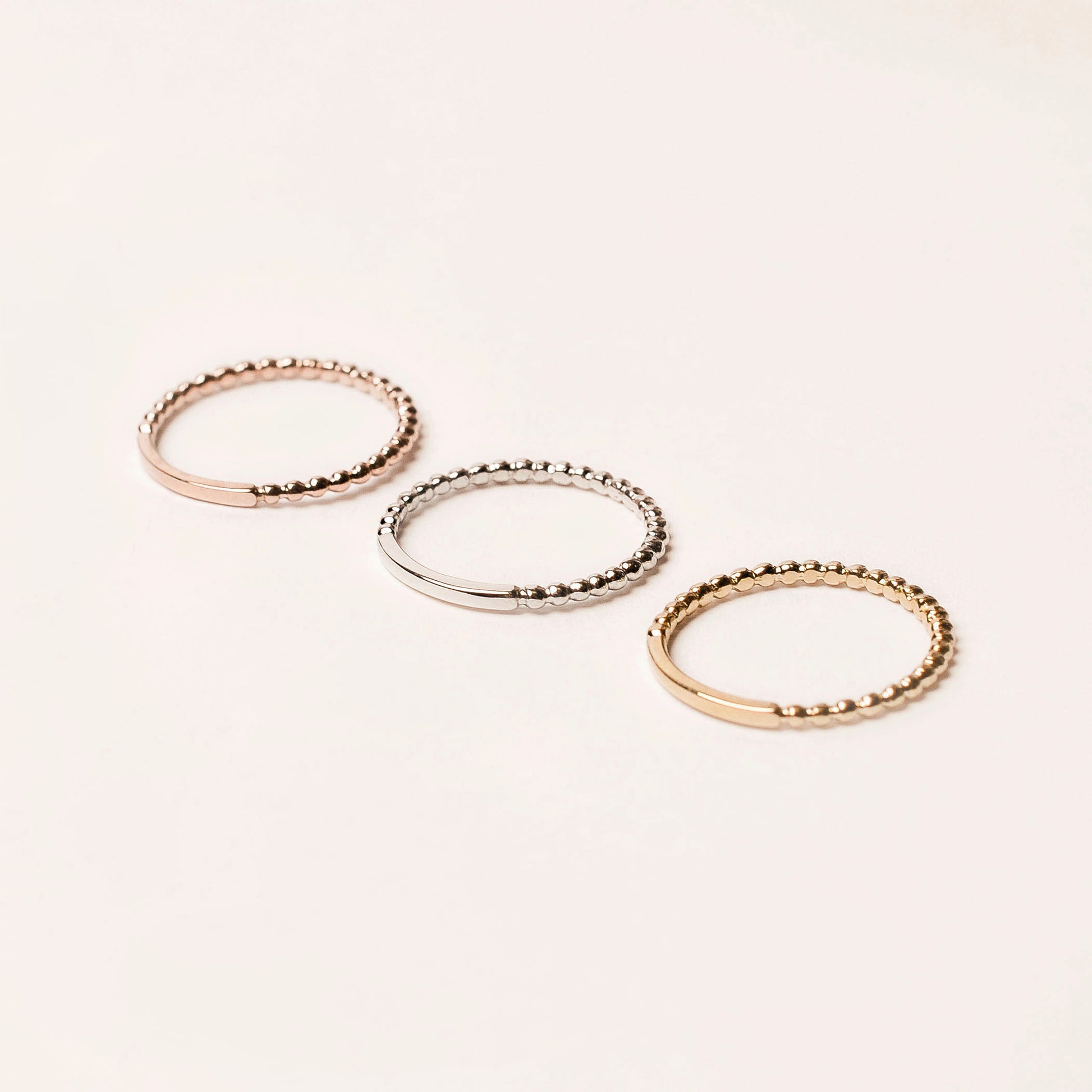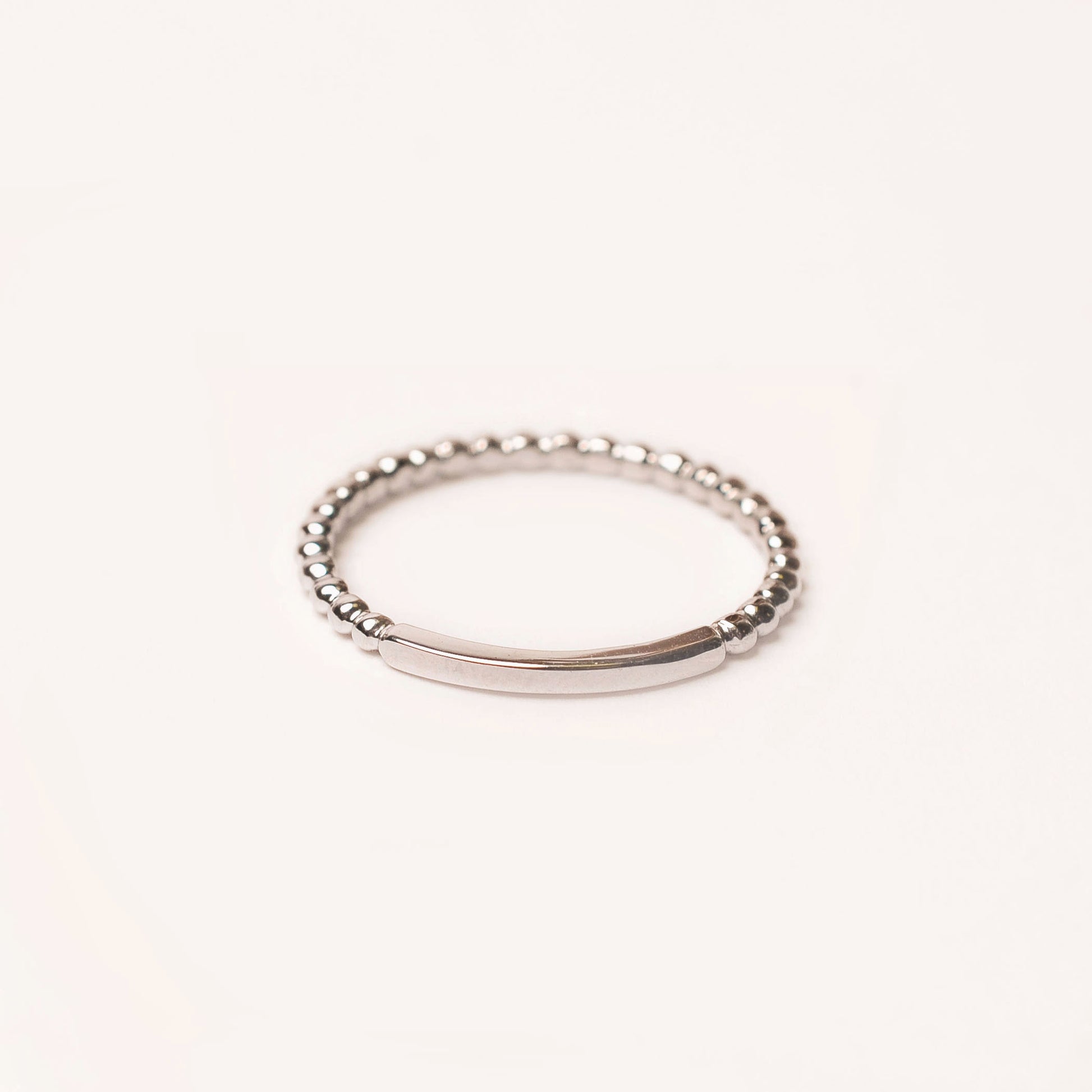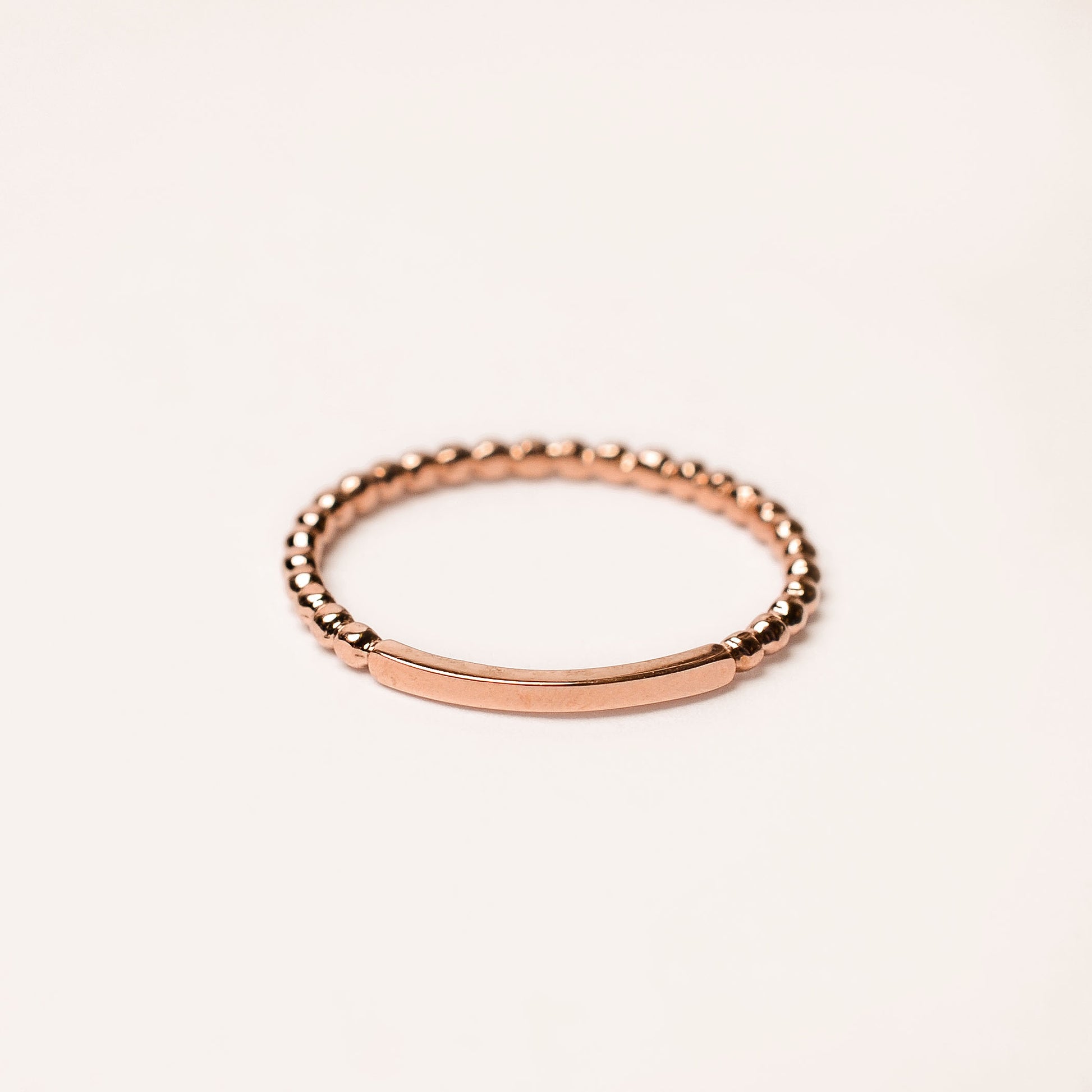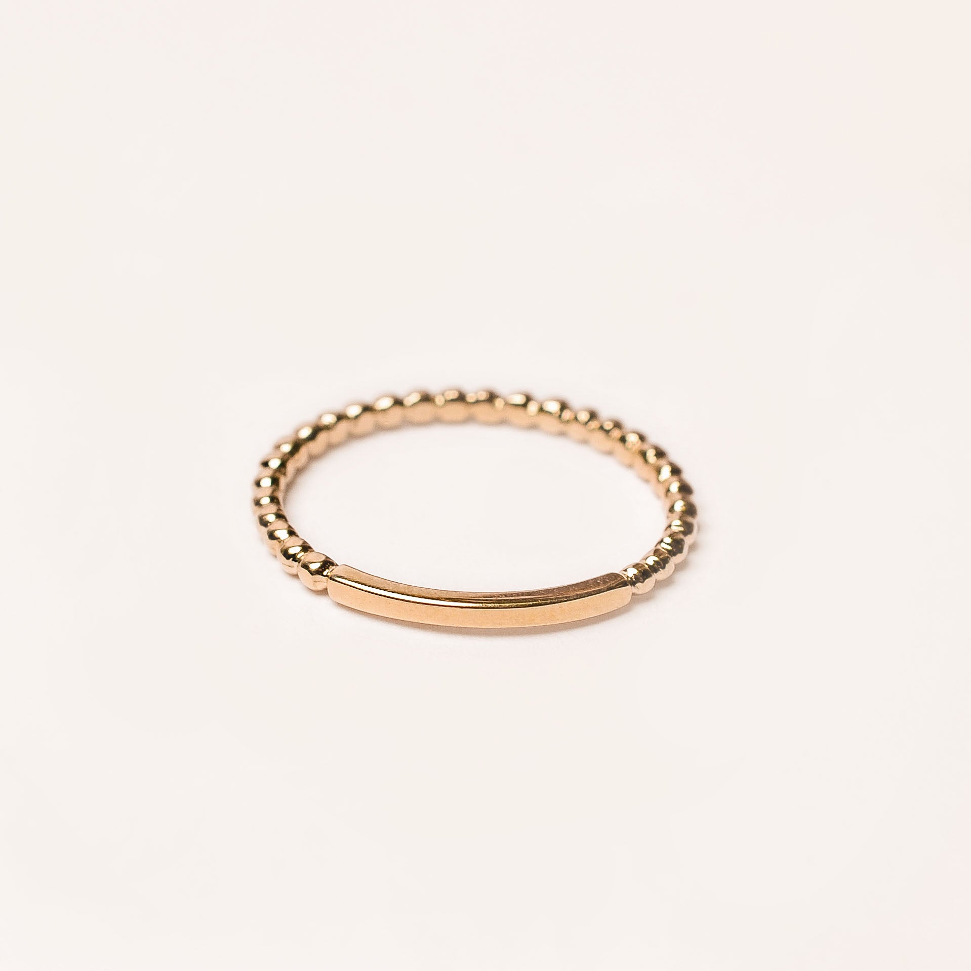 Beaded style 14k band with sizing bar. Available in 14k yellow, rose, and white gold. Price is per single band.