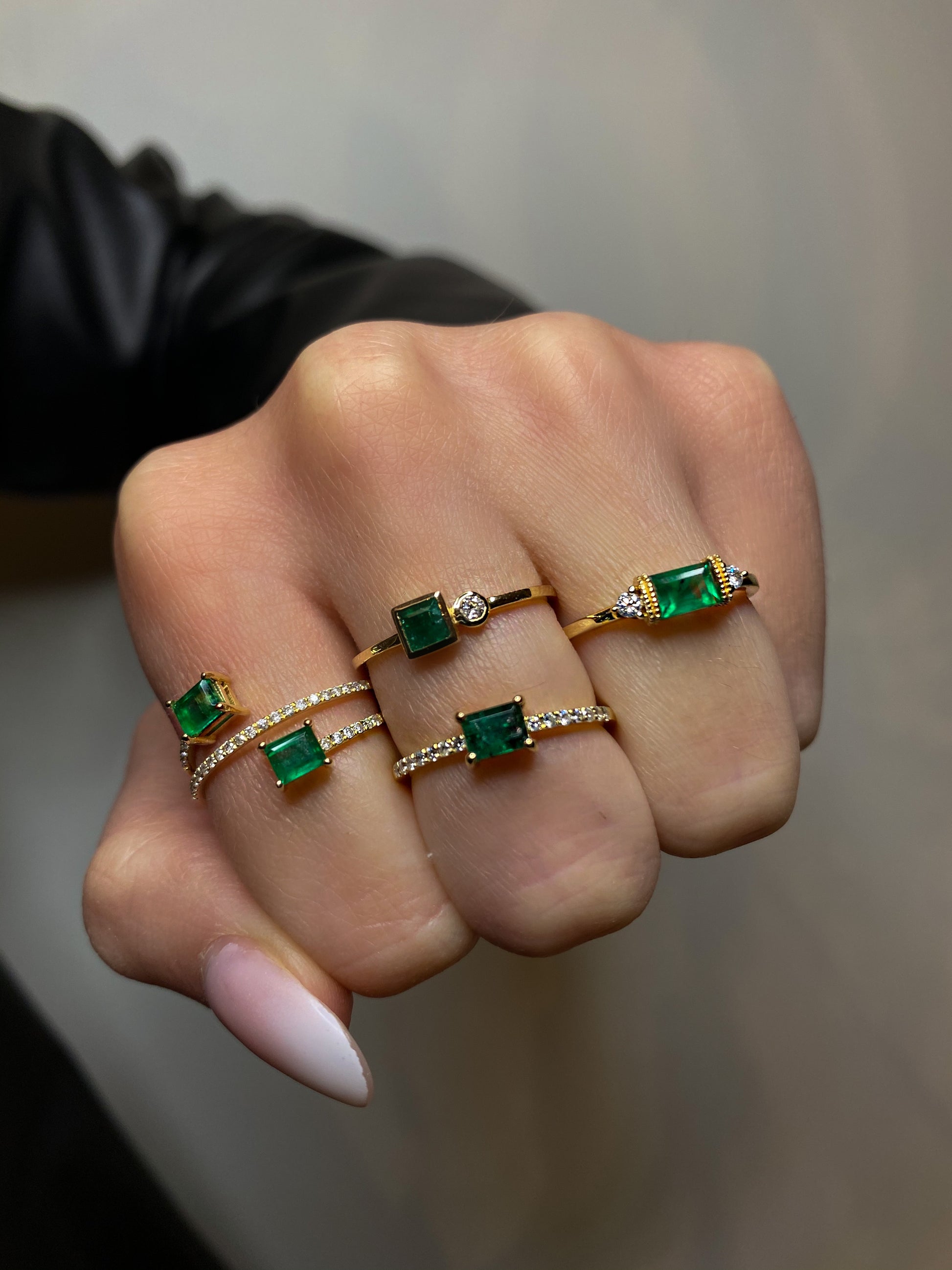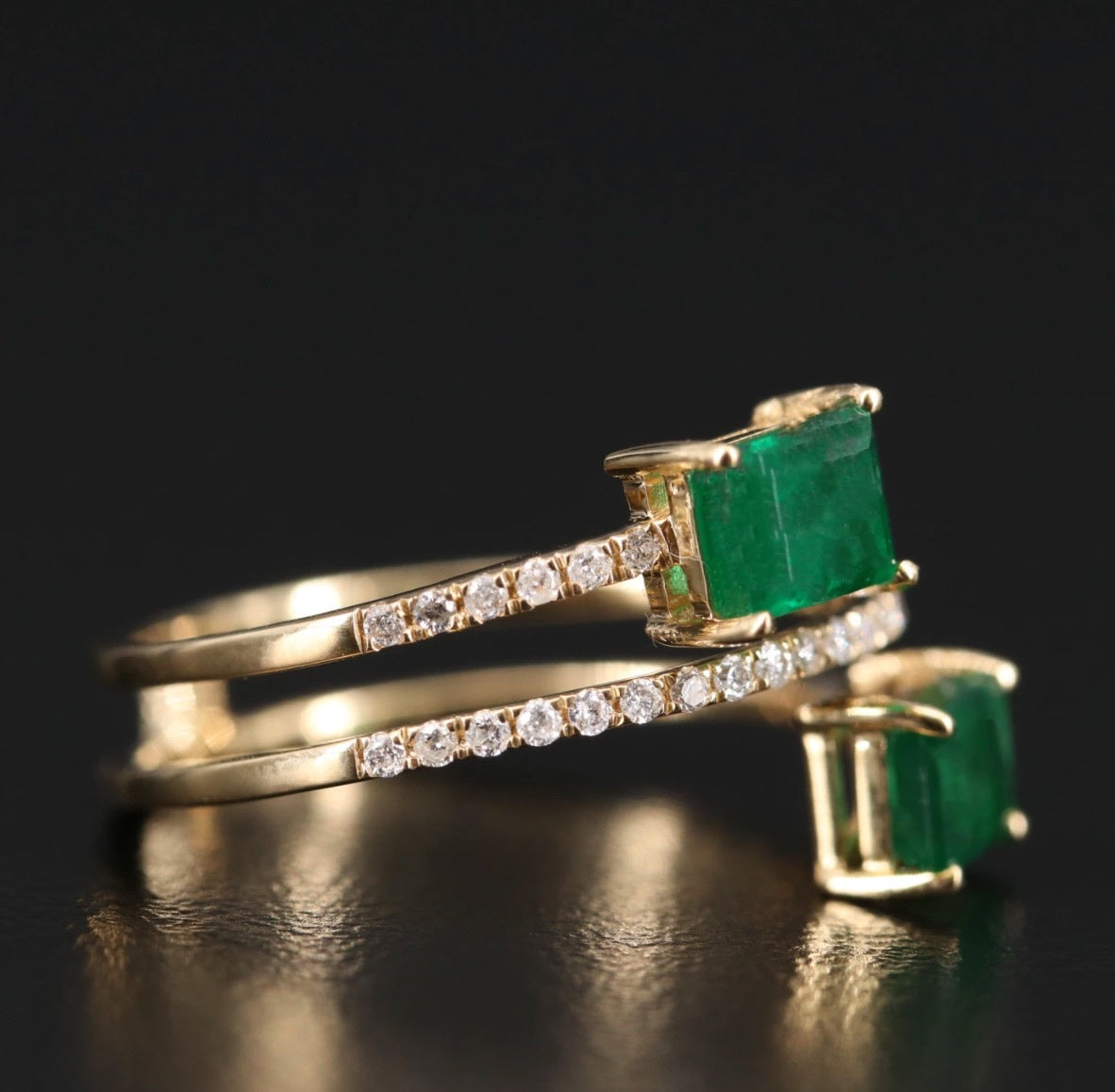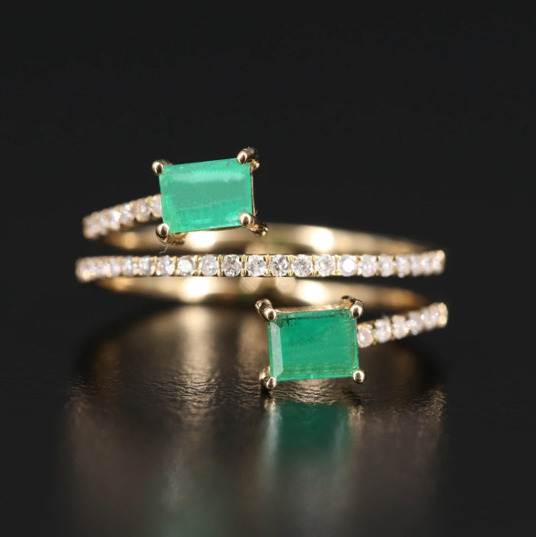 This emerald and diamond crossover bypass ring is an absolute show stopper.