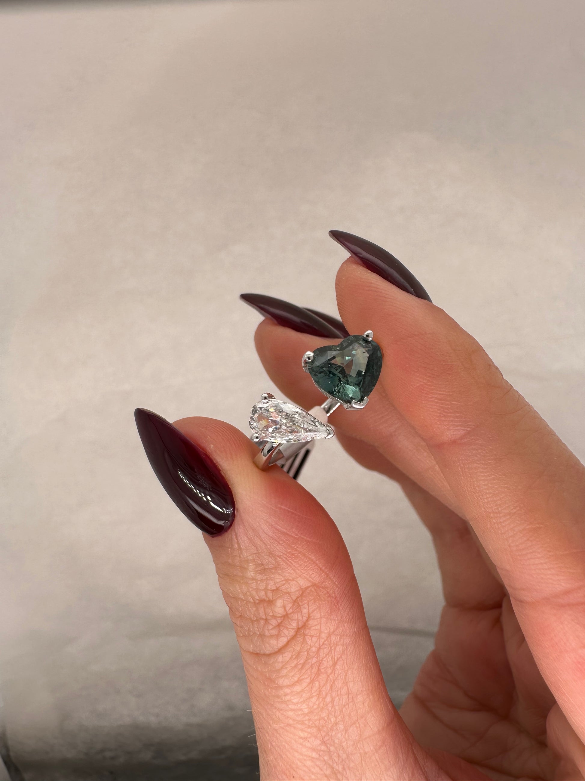 UNHEATED TEAL BLUE SAPPHIRE AND DIAMOND PEAR SHAPE TOI ET MOI